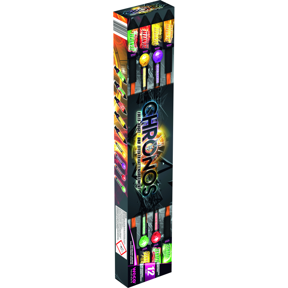Chronos von Weco Feuerwerk ist ein 12-teiliges Raketen-Sortiment mit großen Smiley-Effekten, Brokat-Kronen, roten Knatter-Palmen,