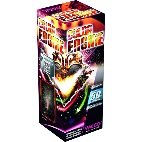 Color Engine von Weco Feuerwerk ist eine Knister-Fontänen-Batterie mit Herrlich knisternde Crackling-Wolken kombiniert mit intensiven grünen und roten Leucht-Sternen!