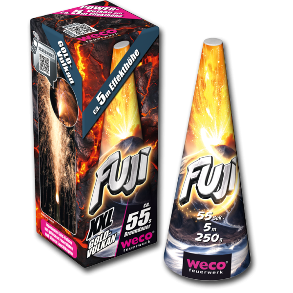 Der Fuji vin Weco Feuerwerk ist ein imposanter Gold-Vulkan mit goldenen Feuerblüten und blauen Leuchtkugeln.
