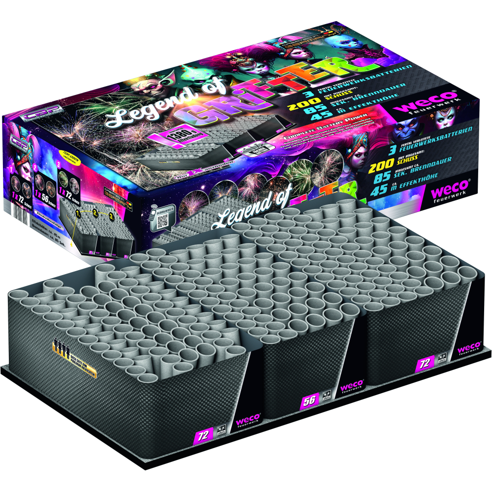 Legend of Grifter von Weco Feuerwerk ist ein 200 Schuss verbund mit ein Brenndauer insgesamt ca. 85 Sekunden