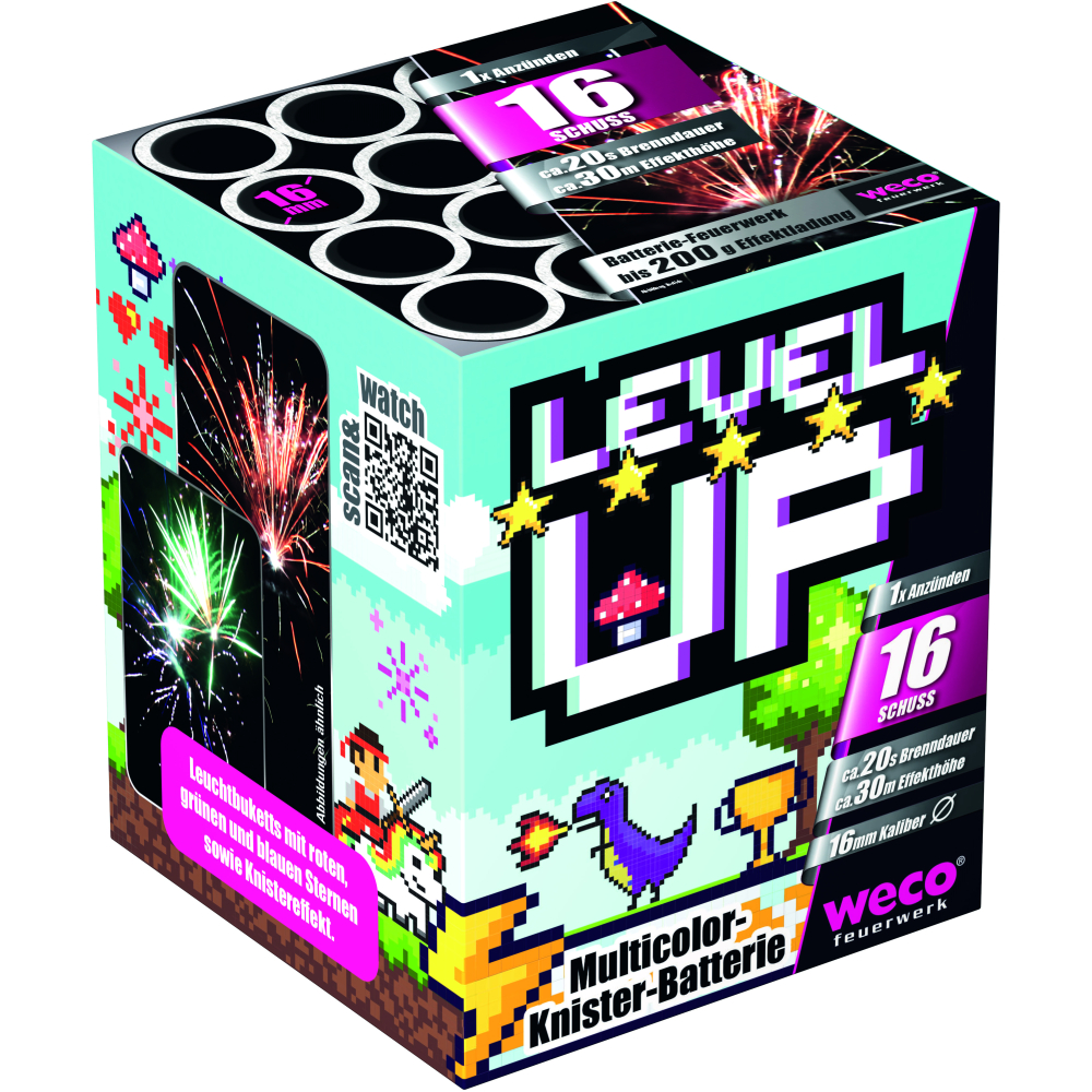 Level up van Weco Feuerwerk ist ein 16-Schuss batterie mit leuchtbuketts mit roten, grünen und blauen Sternen sowie Knistereffekt.