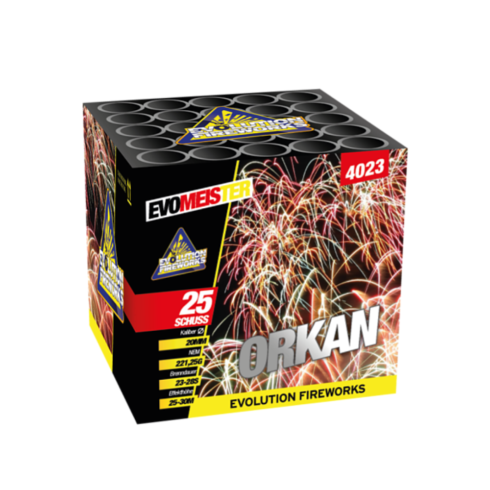 Orkan, 25-Schuss-Feuerwerk. Ein Orkan aus deutschem Feuerwerk mit 25 Schüssen von Evolution-Effekten im deutschen Stil und zu erschwinglichen Preisen.