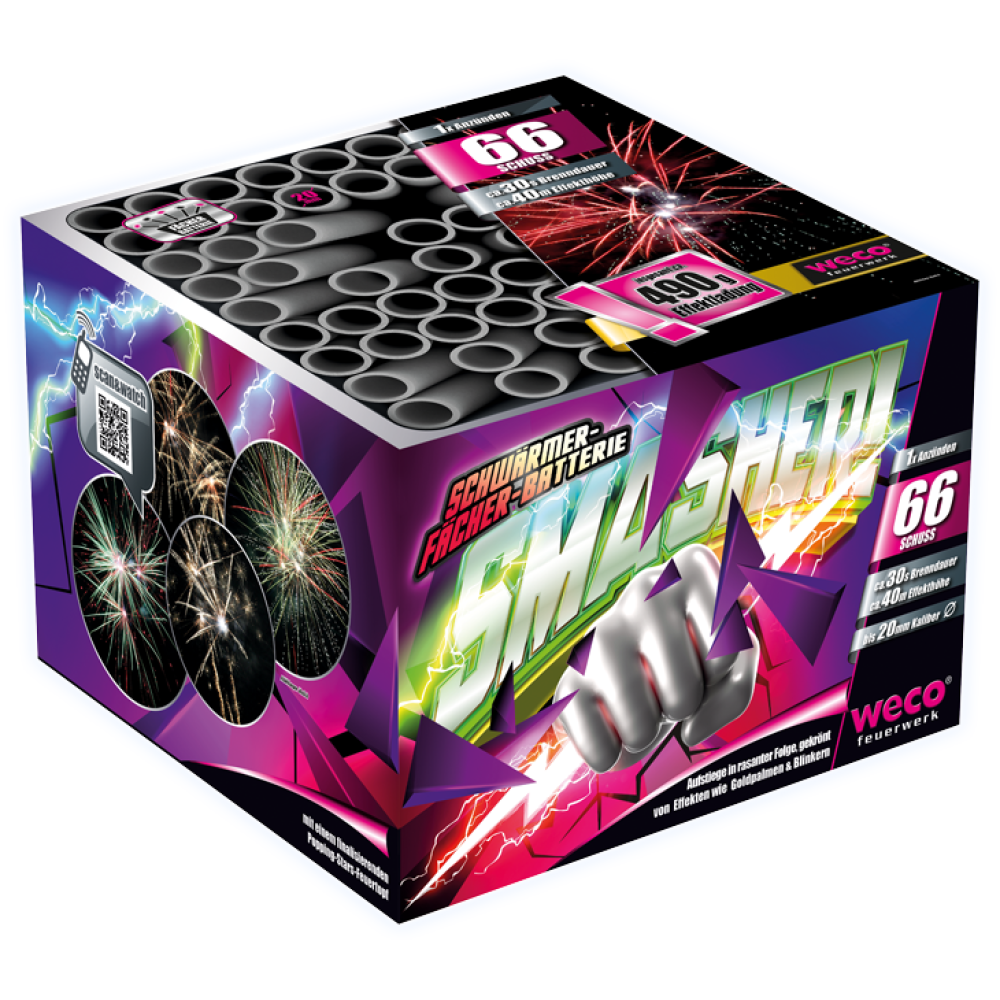 Smasher von Weco Feuerwerk ist ein 66-Schuss-Batterie mit herrliche Aufstiege in rasanter Folge, gekrönt von edlen Goldpalmen in Fächerform geschossen und leuchtstarken Blinker-Effekten mit einem finalisierenden Popping-Stars-Feuertopf.