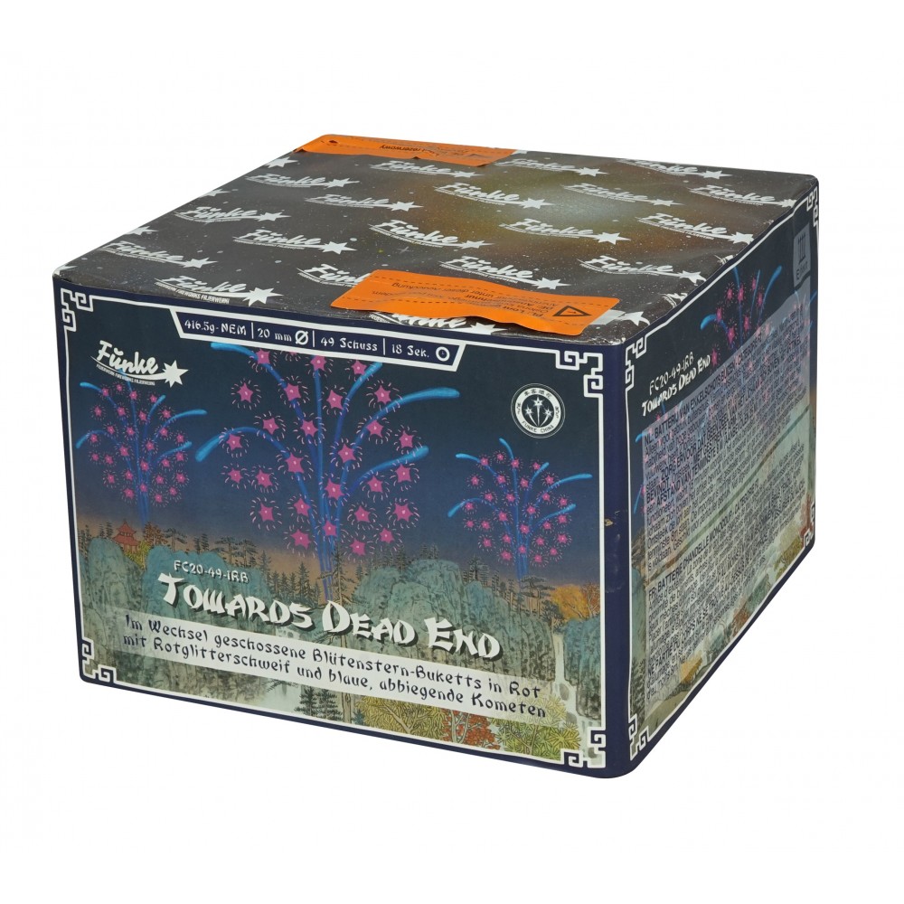 Towards Dead End van Funke ist ein Im Wechsel geschossene Blütenstern-Buketts in Rot mit Rotglitterschweif und blaue, abbiegende Kometen.