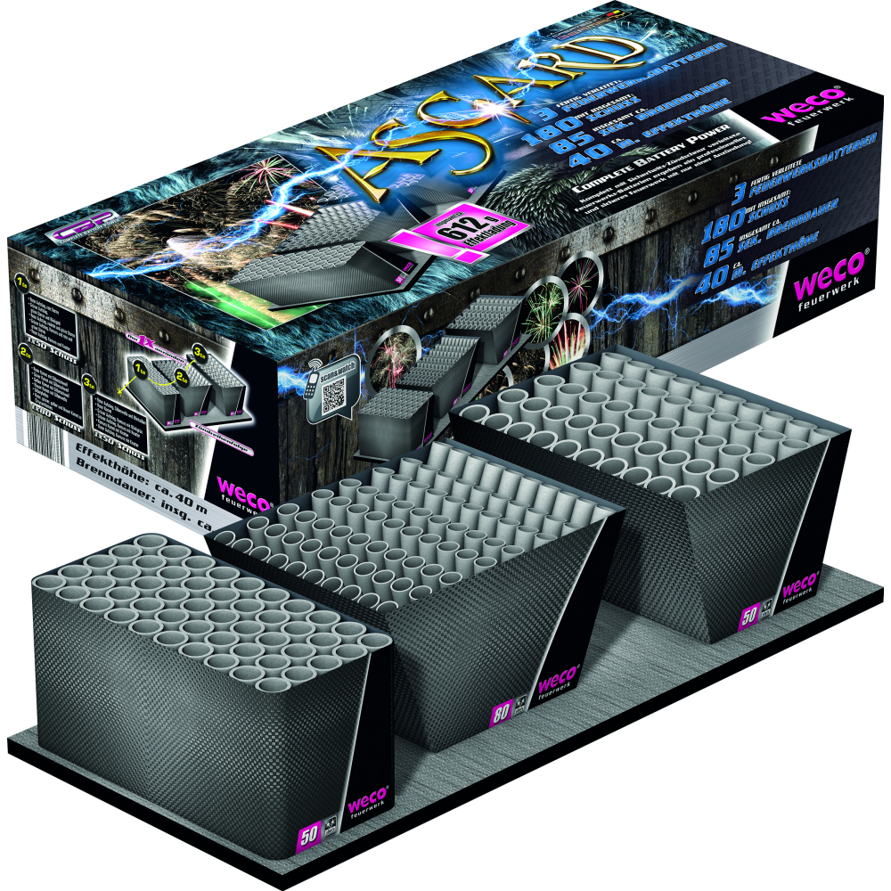 Een systeemvuurwerk met één enkele ontsteking! Drie batterijen, bijzonder effectieve vuurwerkbatterijen. Breng de legende van Asgard tot leven en creëer onvergetelijke momenten met spectaculaire Kamuro-effecten, flitsende sterrenboeketten, grote chrysanten en prachtige zilveren golven.