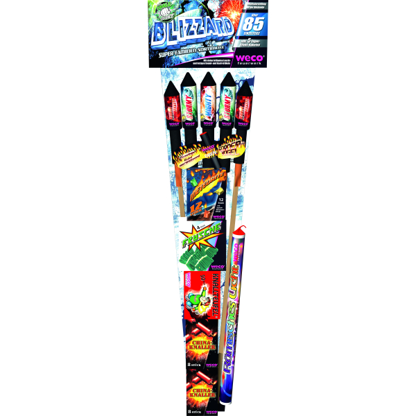 Blizzard van Weco Feuerwerk is een fantastisch familieassortiment met vuurpijlen met robijnrode sterren en brokaatboeketten; sommige met een spannend knaleffect. Het bevat ook vele andere geweldige licht-, geluids-, knal- en jeugdvuurwerkhoogtepunten.