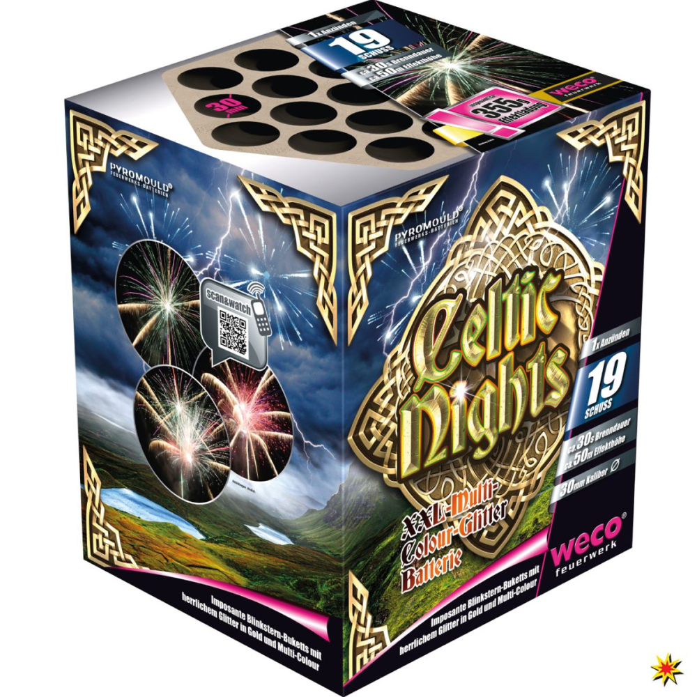 Celtic Nights van Weco Fireworks is een batterij met 19 schoten en indrukwekkende glinsterende sterrenboeketten in glorieus goud en veelkleurige glitter.