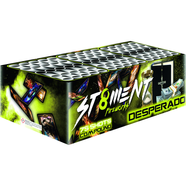 De Desperado van St8ment is een unieke compound van drie 25 shots fanshape cakes! Geweldig heldere siereffecten worden in vijf breed de lucht in geschoten! Een spektakel om gek van te worden!