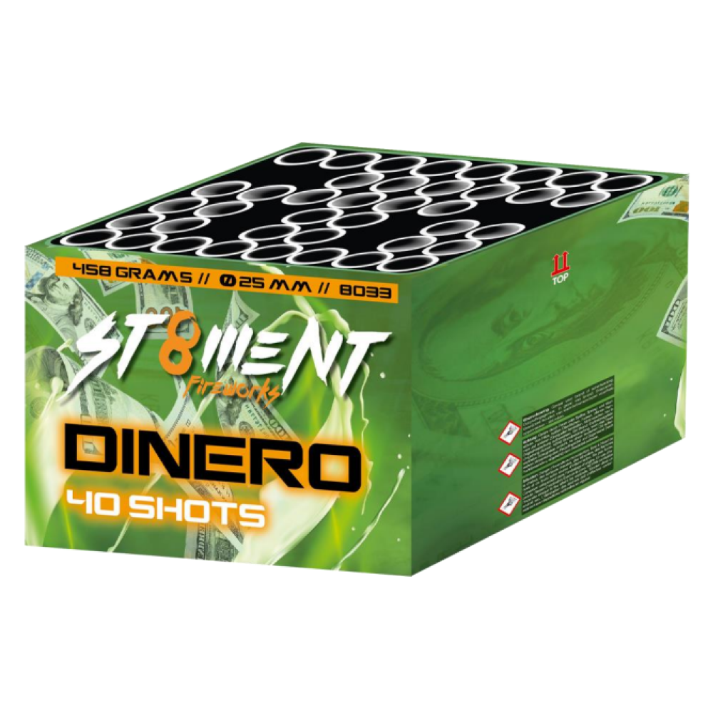 Dinero van St8ment is een siercake met 40 schoten siervuurwerk. Voornamelijk gouden effecten gecombineerd met gekleurde parels.