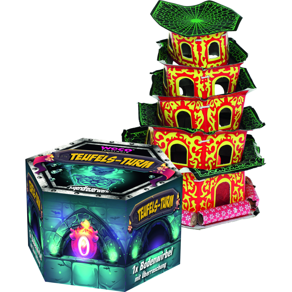 Teufelsturm van Weco Feuerwerk is een leuke grondspiraal met meerdere transformaties en een laatste verrassing.