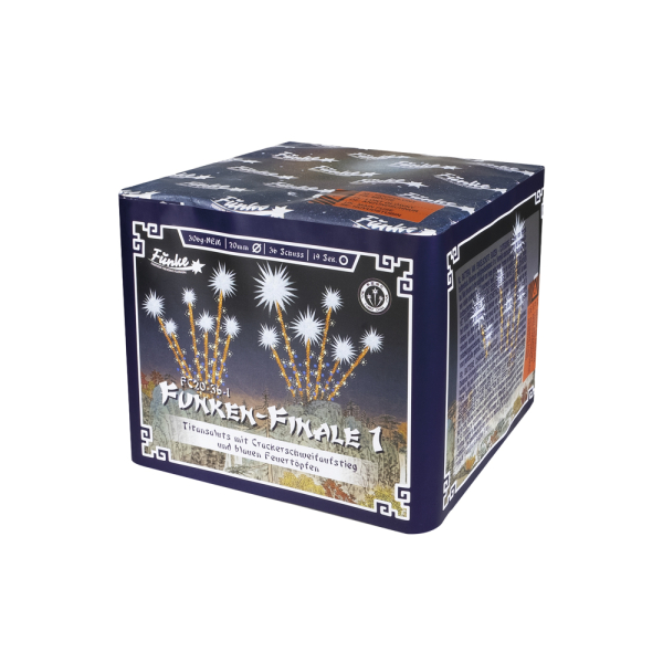 Funken-Finale 1 van Funke is een titanium saluutbatterij met 36 schoten in 20mm-kaliber, bestaande uit blauwe vuurpotten, een crackerstaart en een laatste titanium saluut. Afgevuurd in een snelle, escalerende reeks.