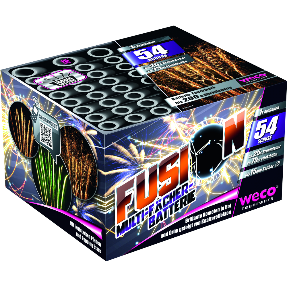 Fusion van Weco Feuerwerk is een batterij van 54 schoten met schitterende kometen in rood en groen, gevolgd door indrukwekkende knetterende effecten met luide fluittonen en ploffende sterren, elk schot in de vorm van een waaier.