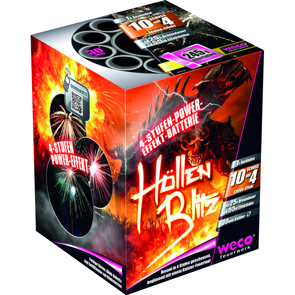 Höllenblitz van Weco Feuerwerk is een 10-schotsbatterij met geknetter, gekleurde sterren, flitsende boeketten en gouden glitters met flitsende sterren. Altijd snel afgevuurd in 4 fasen.