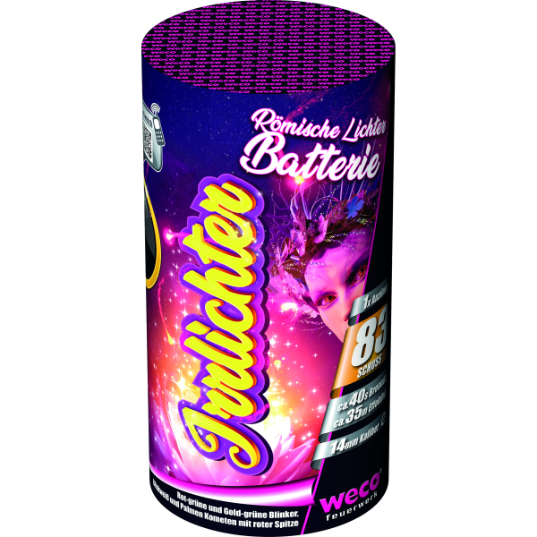 Irrlichter van Weco Fireworks is een Romeinse kaarsbatterij met prachtige rood-groene en goud-groene flitslichten, evenals flitsende witte lichten en palmkometen met rode punten.