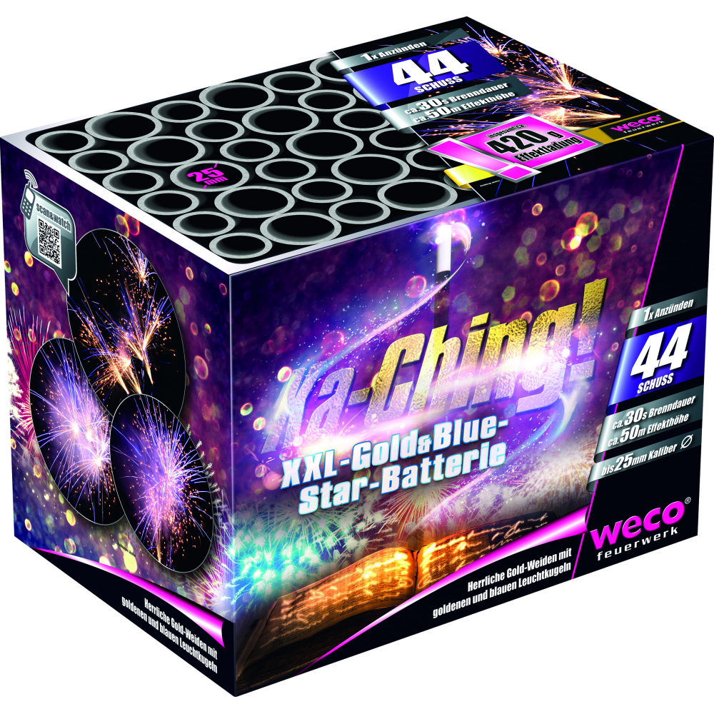 Ka-Ching! van Weco Feuerwerk is een batterij met 44 schoten, met prachtige blauwe kometen met staarteffecten in blauwe en gouden glitter, en glinsterende sterrenboeketten