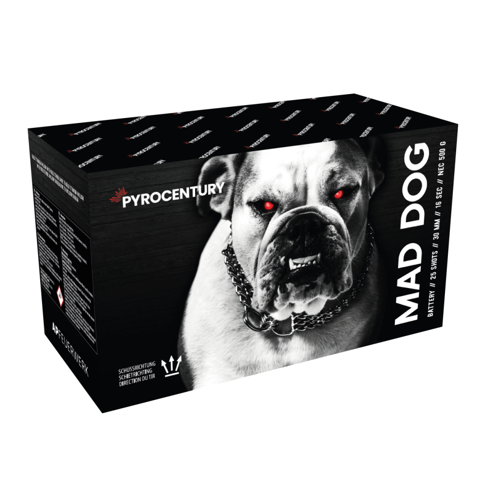 De Mad Dog van Pyrocentury, een batterij met 25 schoten, met Crackling vuurwerktop en Crackling staart die veranderen in grote Crackling Chrysanten.