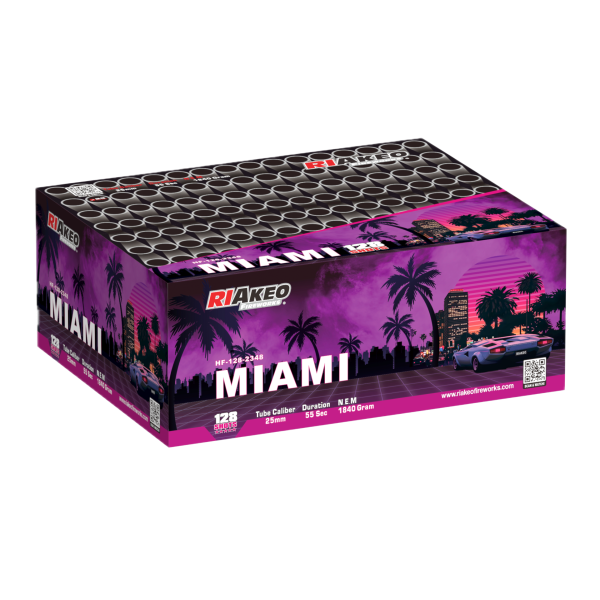De Miami van Riakeo Fireworks is een spectaculair samengesteld vuurwerk met 128 schoten in 25 mm kaliber en een NEM van 1,84 kg. Deze show van ongeveer 50–55 seconden biedt een brede mix aan effecten die in diverse fanning-patronen worden geschoten. Hoogtepunten zijn neonkleurige peonies in combinatie met rode of witte blinksterren, indrukwekkende gouden weiden met sprankelende “spinning tails” en een groots finale-effect. Dit slotstuk bestaat uit krachtige gouden wirbelschweif-opstijgers die exploderen in gigantische titan-goudweiden, waardoor de lucht volledig wordt gevuld met gouden pracht. Een echte topper voor iedereen die een complete show in één wil beleven.