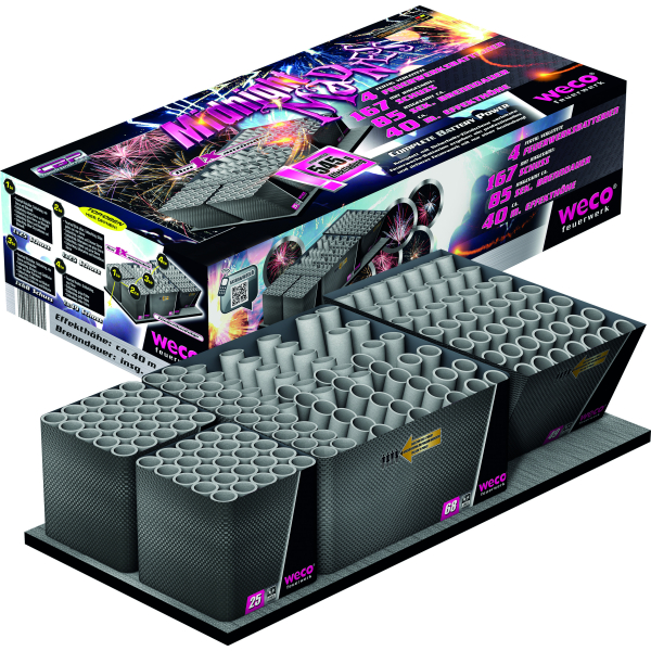 Midnight Madness van Weco Fireworks is een vuurwerksysteem met één ontsteking! Vier aan elkaar gekoppelde, extra krachtige vuurwerkbatterijen. Soms heb je een dosis waanzin nodig om je leven op te vrolijken! Krachtige vuurpotten, kleurrijke boeketten met fonkelende sterren, zilveren palmen, gouden kronen en grote palmeffecten verlichten de duisternis.