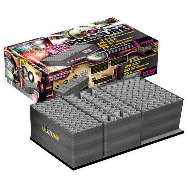 Overpressure van Weco Feuerwerk is een compound van 176 schoten met een ultiem samenspel van pure energie en krachtige effecten, zoals grote gouden wilgen, gouden palmen, brokaatkronen, felle flitseffecten, knetterende knalsterren en prachtige waaiervormige brokaatkronen met blauwe punten.