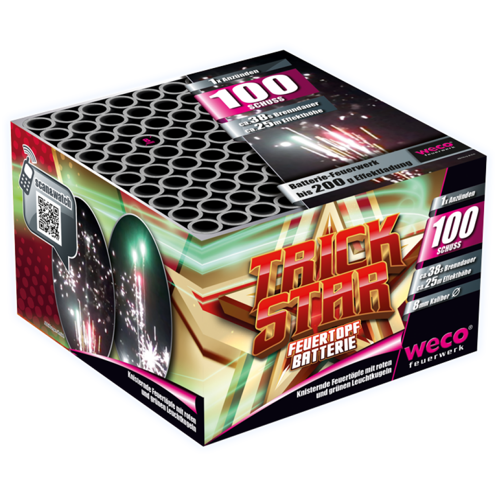 Trickstar van Weco Feuerwerk is een 100-schots batterij bestaande uit prachtig knetterende vuurpotten met rode en groene lichtballen.