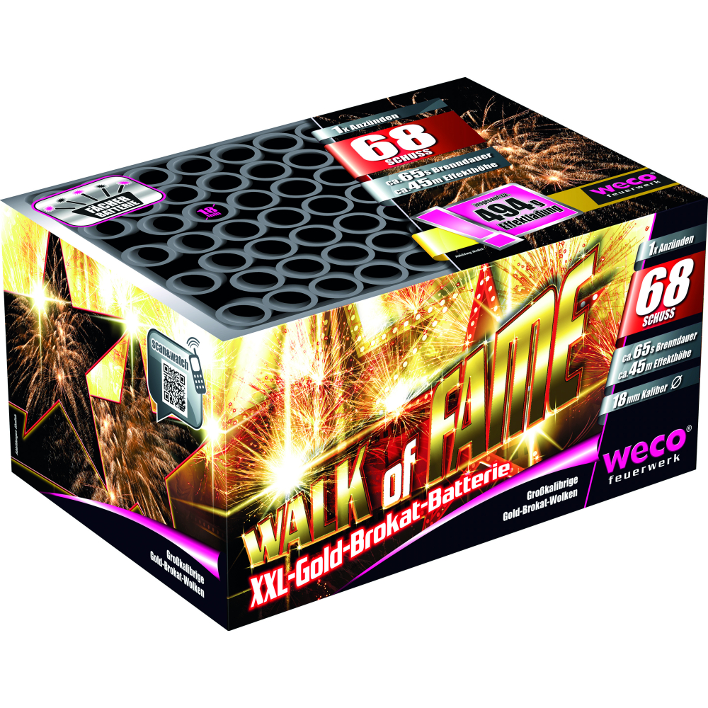 Walk of Fame van Weco Feuerwerk is een 68-schots batterij van Weco met Indrukwekkende gouden lichtgevende kometen met bijzonder grote en krachtige brokaatboeketten.